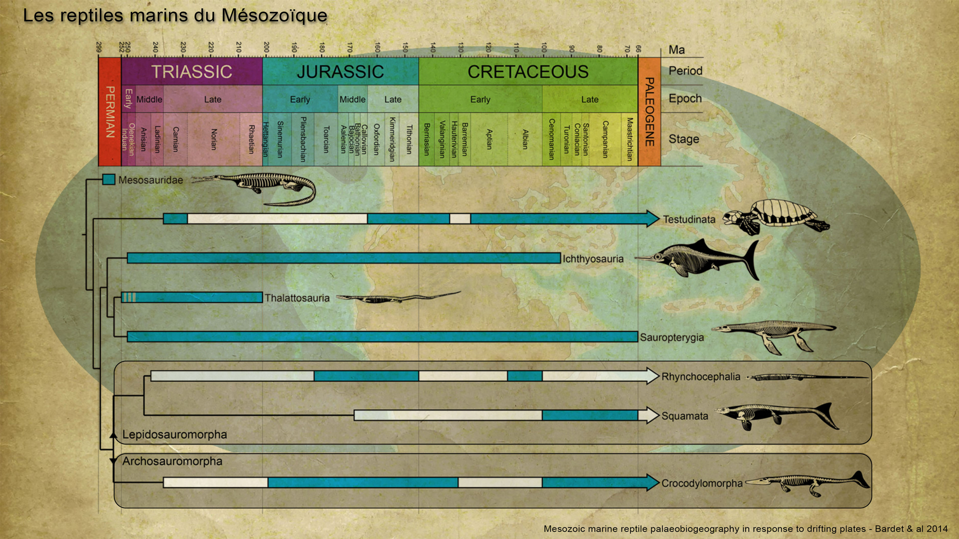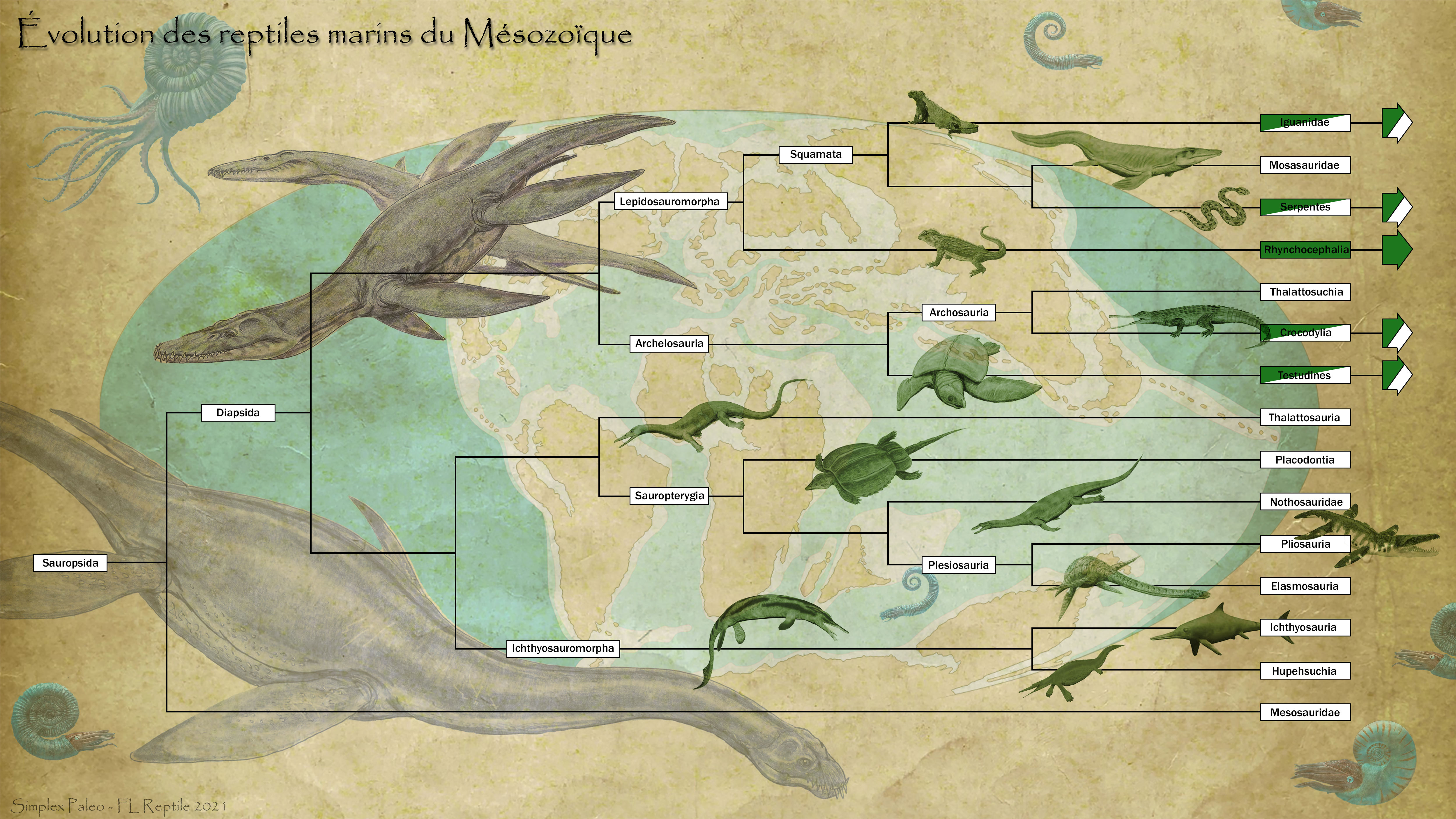 Les reptiles sont répartis en trois groupes distincts, les archosaures d’où émergeront d’une part les crocodiliens, et d’autre part, les reptiles volants, les dinosaures et par extension, les oiseaux. Puis nous avons les deux autres grands groupes de reptiles. Deux grands groupe aux origines terrestres et dont certains membres vont par la suite opter pour le monde marin, et tout comme les dinosaures, leur aventure débute au cours du Trias.