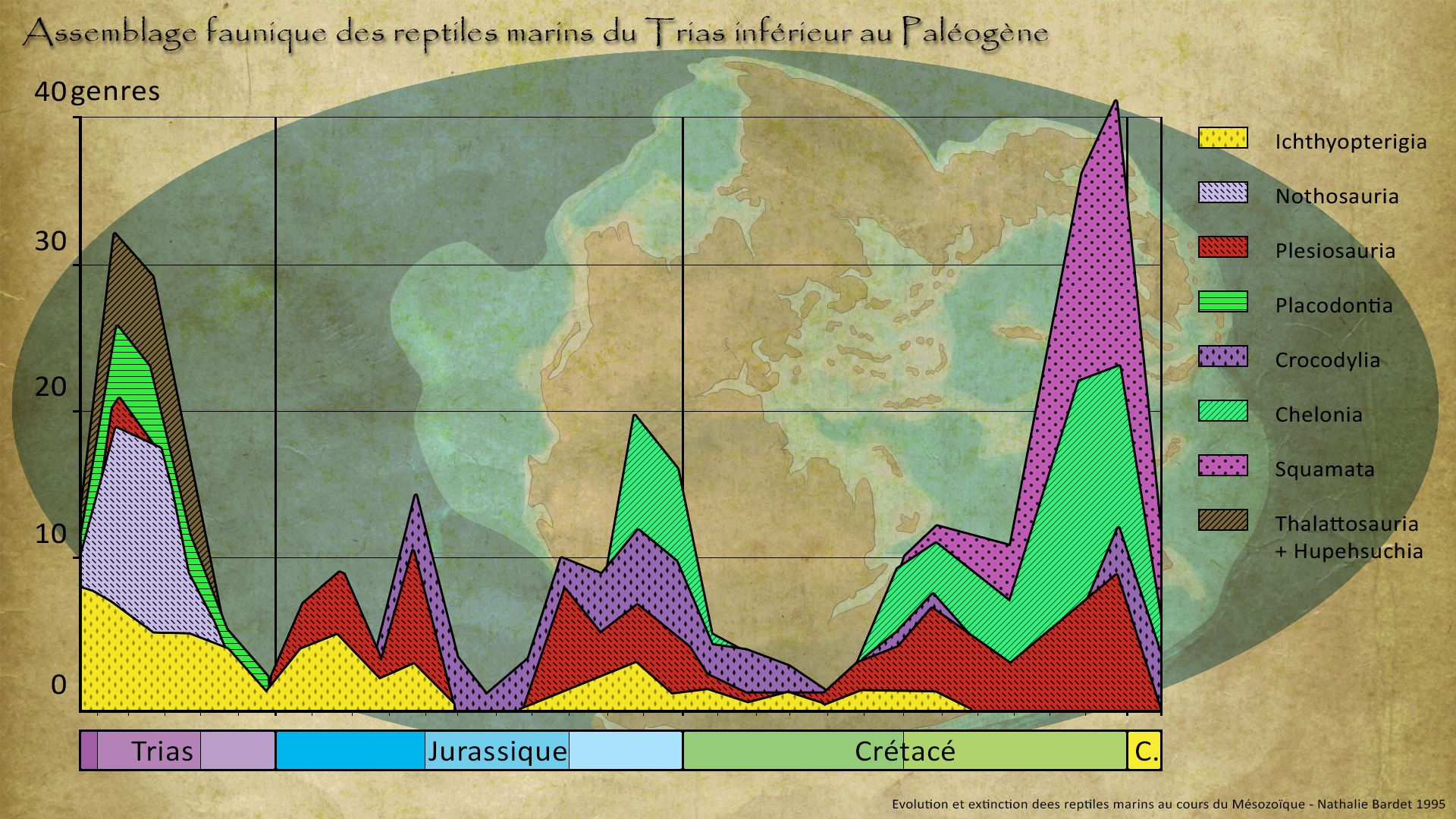 Tout du moins, c’est que l’on peut supposer en regardant les divers graphiques, cependant dans le livre de Nathalie Bardet est ses confrères, il est dit que « La disparition des Thalattosaures à la fin du Trias reste pour l’instant inexpliqué ? »