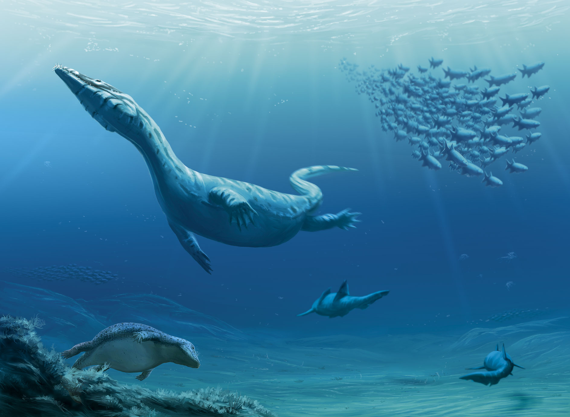 Nous voici donc aux prémices d’une nouvelle période, le Jurassique, la seconde période de l’ère Mésozoïque. Si nous faisons un petit état des lieux, nous constatons que la majeure partie de la faune de reptiles marins du Trias à disparue, seul demeure le grand groupe des ichthyosaures.