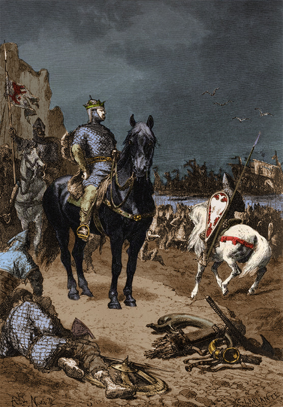 Le Bâtard réunit donc une flotte et une armée puissante (sans doute 650 nefs et 7.000 hommes) à Saint-Valéry-sur-Somme, traverse la Manche et débarque le 29 septembre 1066 sur la plage de Pevensey, et en une seule bataille, le 14 octobre 1066, à Hastings, tue Harold et bat les Saxons, qui font soumission.